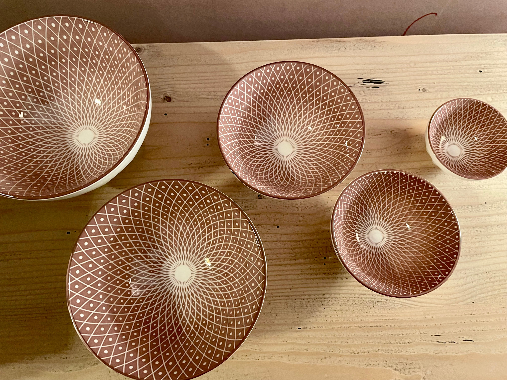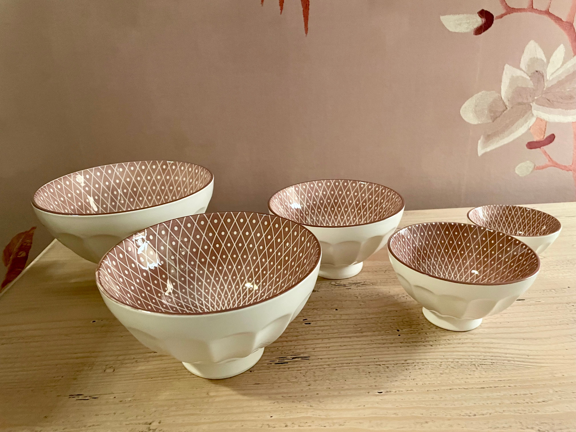 Arés latte kulhot kuviolla, 5 kappaleen setti. Kaikki eri kokoa.