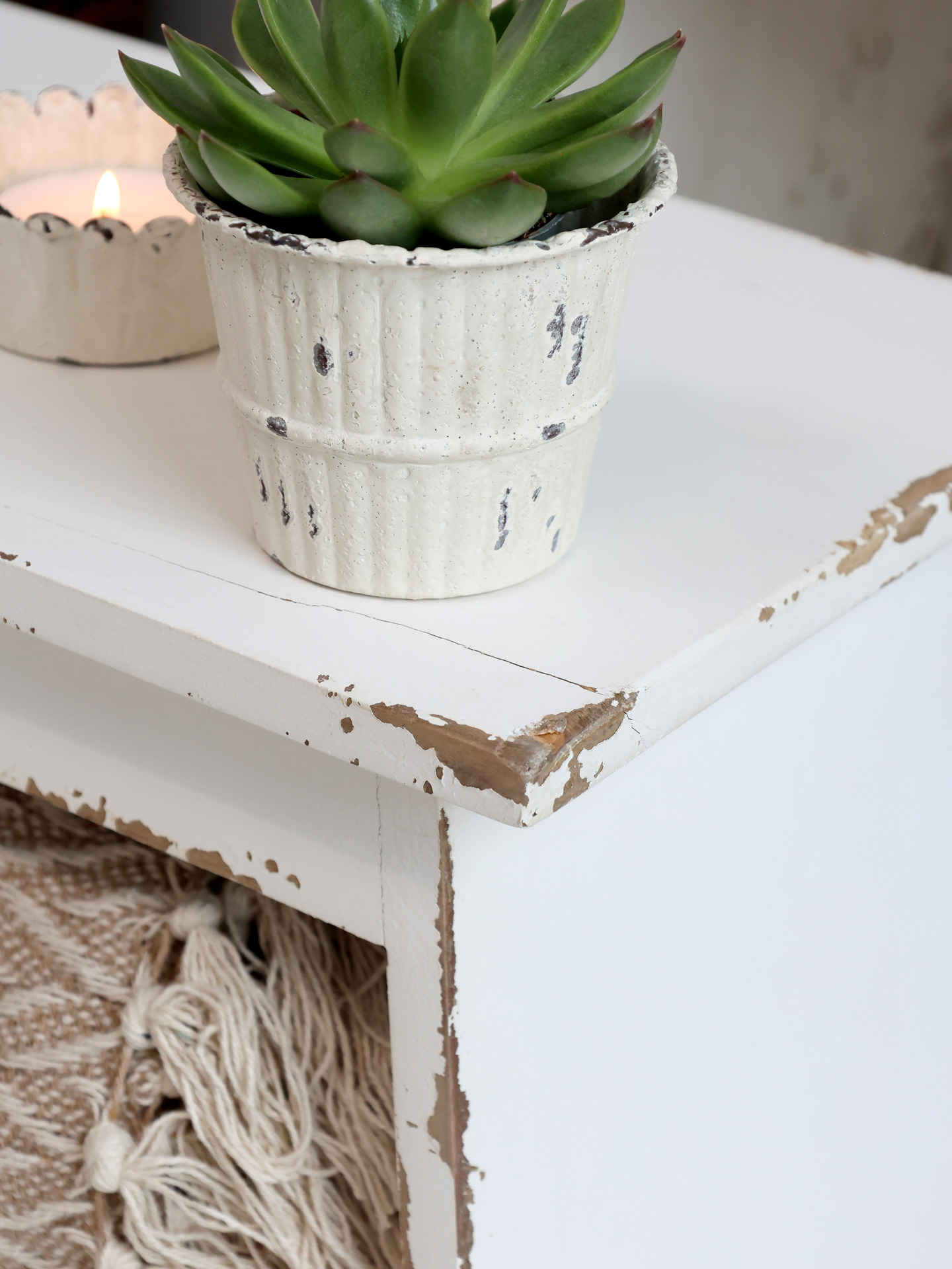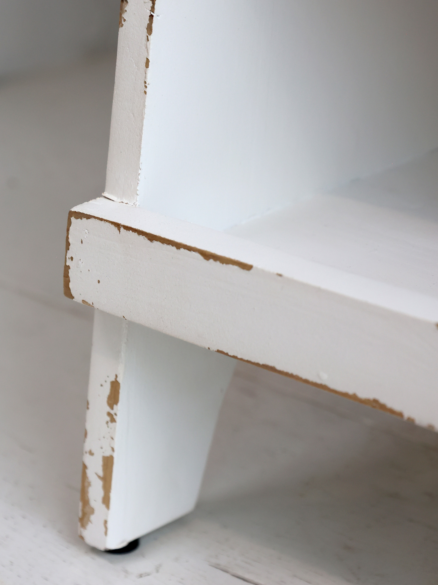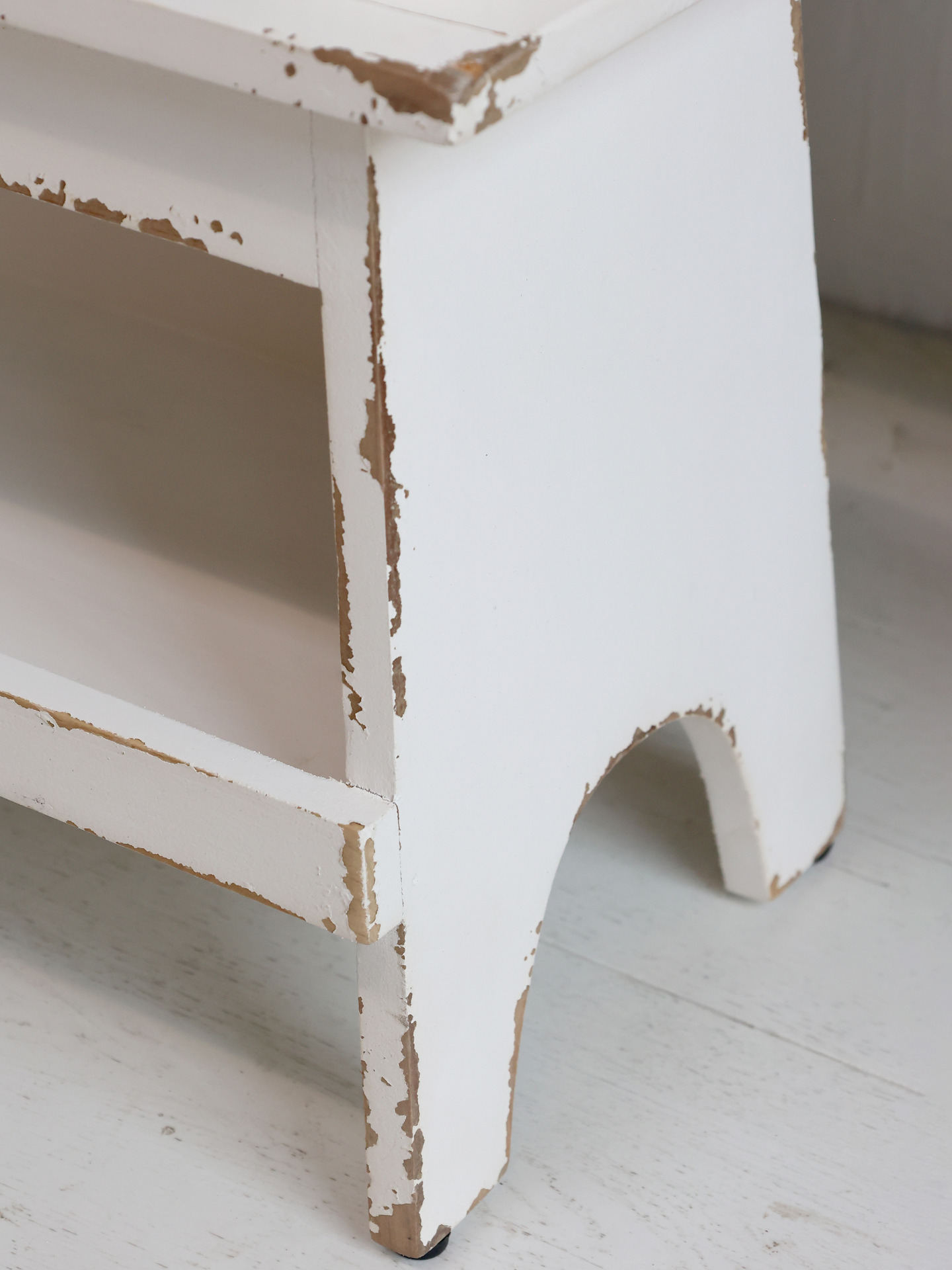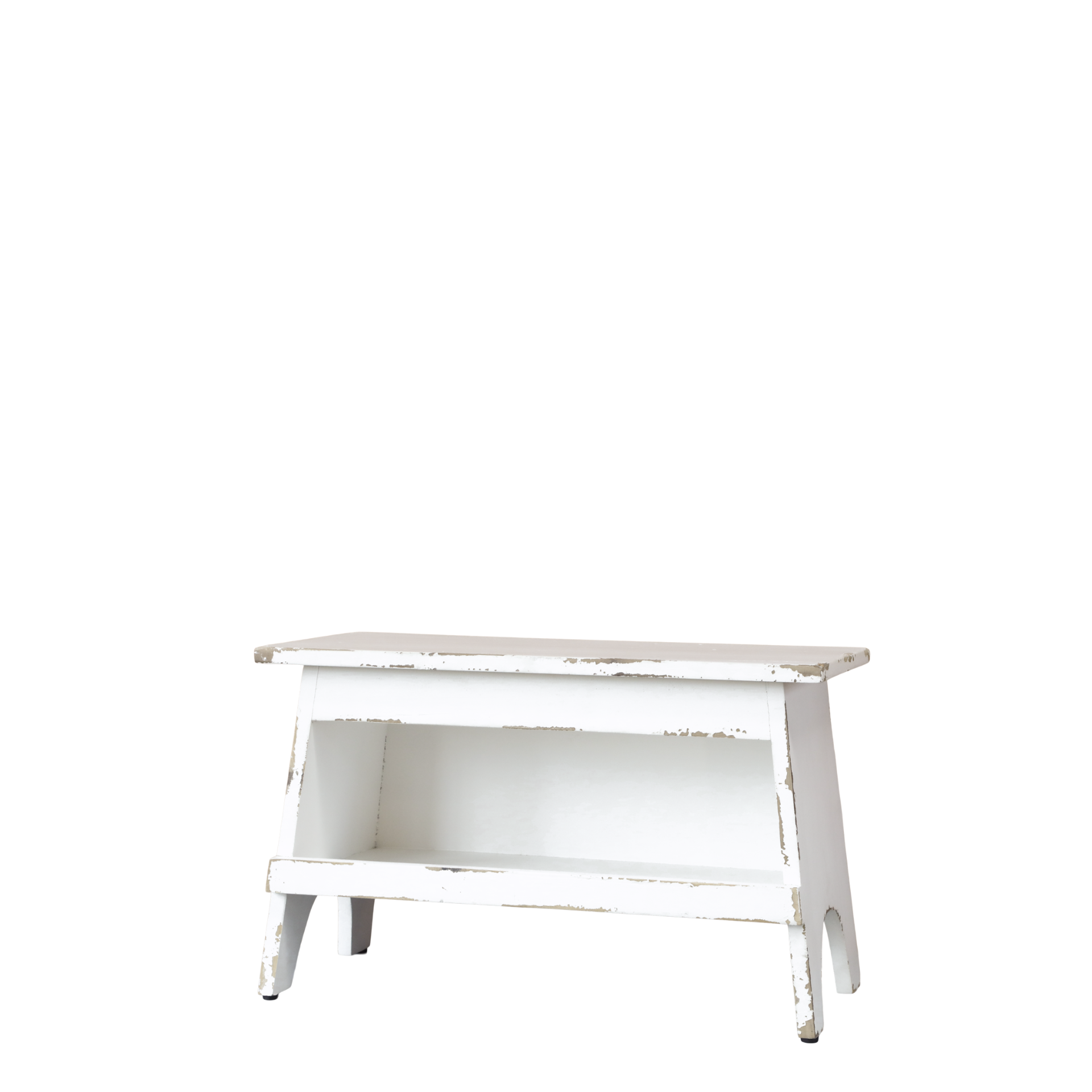 Denna bänk/pall som är målad i antikvitt bidrar med gammaldags charm och en rustik känsla till ditt hem. Den slitna ytan gör varje exemplar unikt och ger möbeln karaktär. Pallen har en praktisk hylla som passar perfekt för att förvara t ex filtar, tidskrifter eller småsaker.