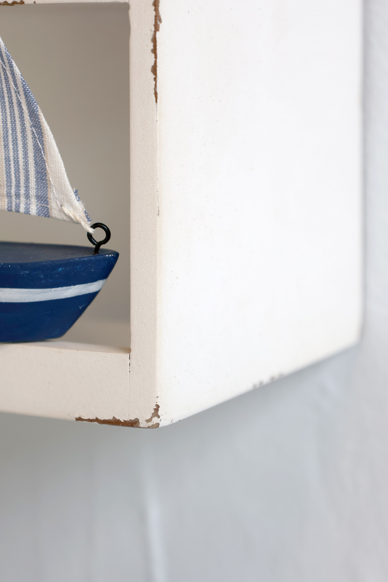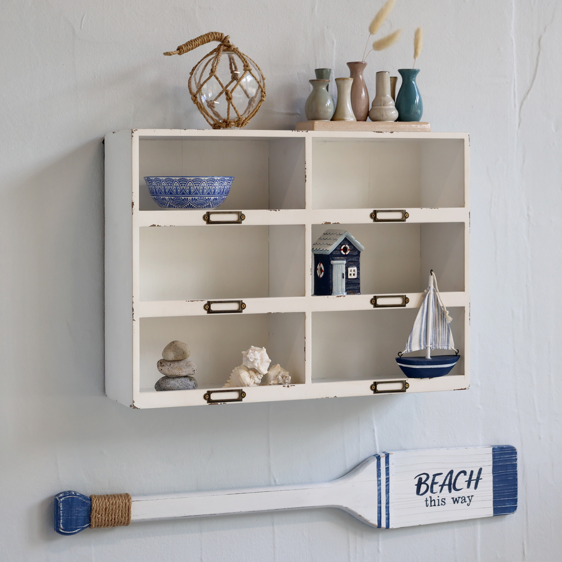 Hyllan är uppdelad i sex fack – perfekt för små favoritsaker, snäckor, ljus, miniatyrer eller andra dekorativa inslag. De små metallbeslagen framtill förstärker den lantliga karaktären och ger en subtil vintagekänsla.
