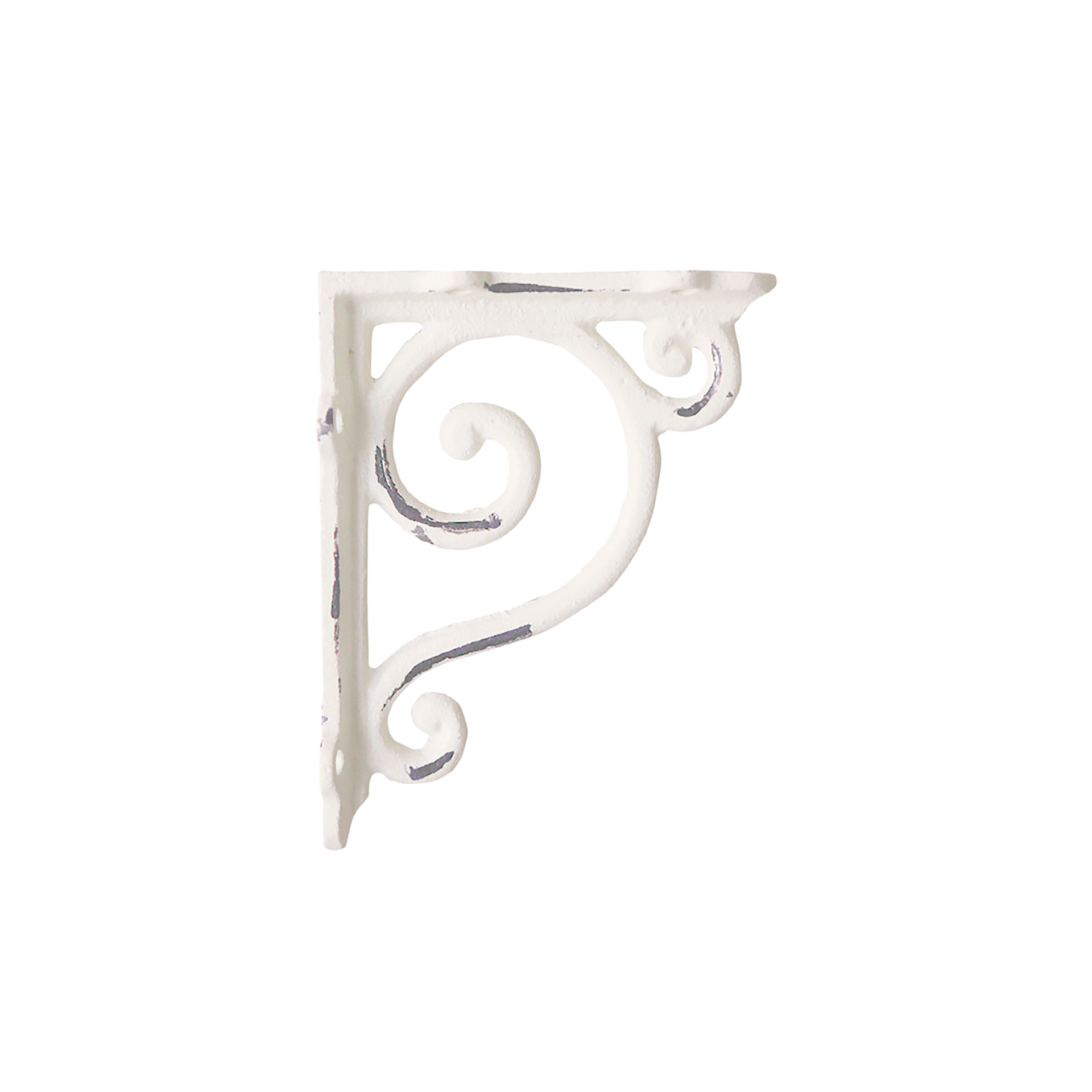 Dekorativ och robust konsol i gjutjärn, till vägghylla i lantlig stil. Antik krämvit nyans med avsiktligt slitna fläckar, patina. Passar perfekt som shabby chic detalj, till exempel i badrummet eller köket. T ex som hållare för hylla gjord av en gammal bräda. Beroende på längden kan du behöva fler konsoler.
