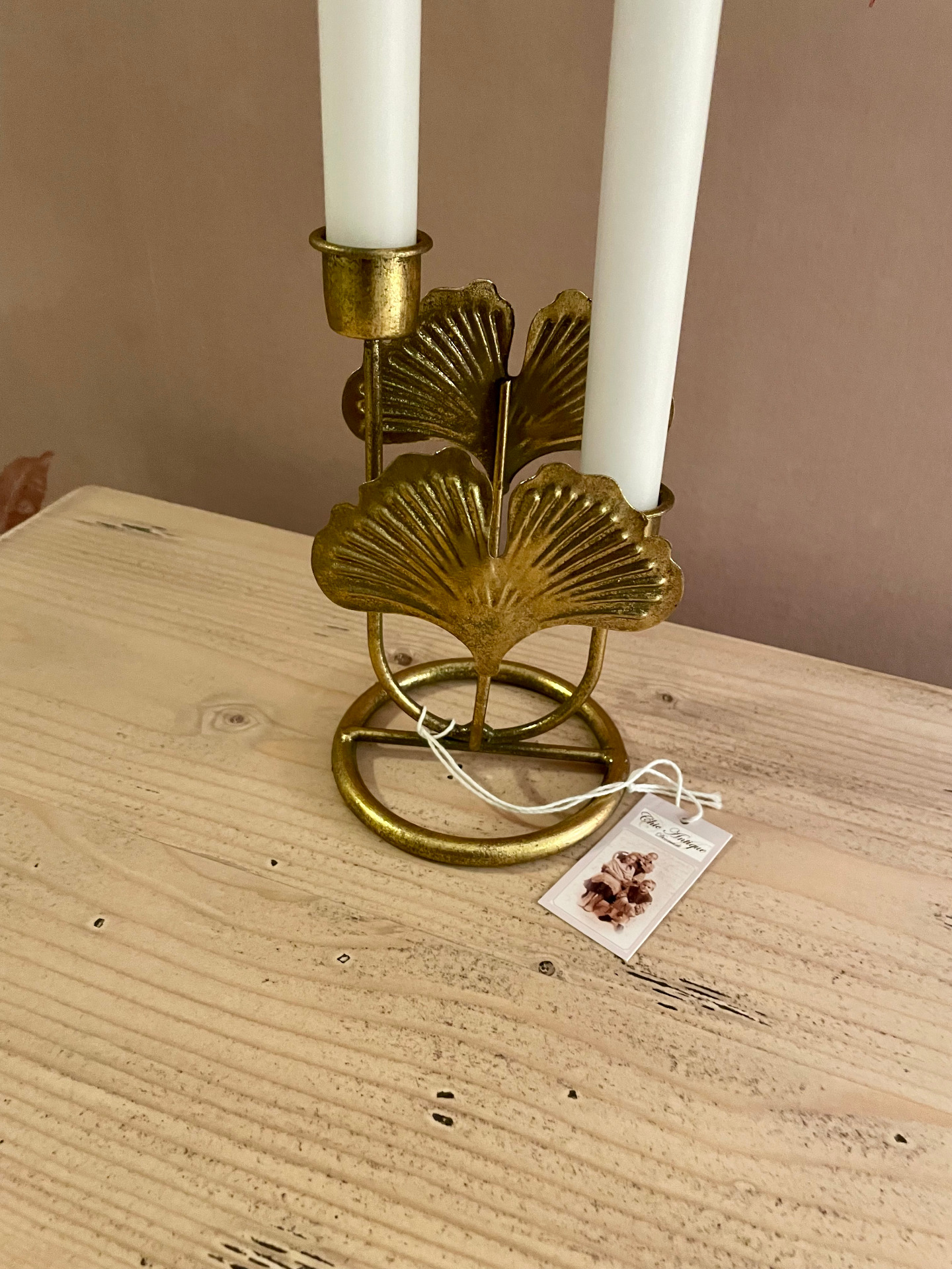 Elegantti jugendtyylinen, antiikkimessinkinen kynttilänjalka on koristeltu luonnon inspiroimilla yksityiskohdilla. Kauniit lehdet ovat saaneet mallinsa Neidonhiuspuusta, Ginkgo biloba -kasvista. Tämä ainutlaatuinen muotoilu antaa sisustuksellesi ripauksen hienostuneisuutta. Tilaa kahdelle kynttilälle.