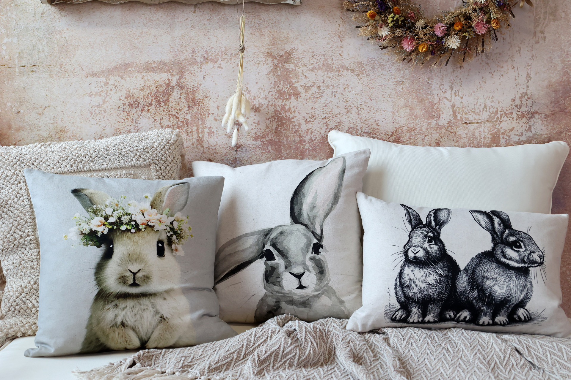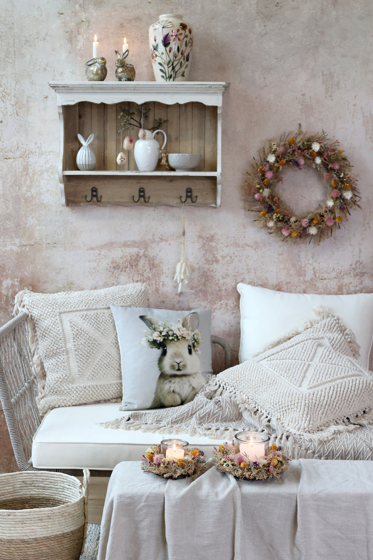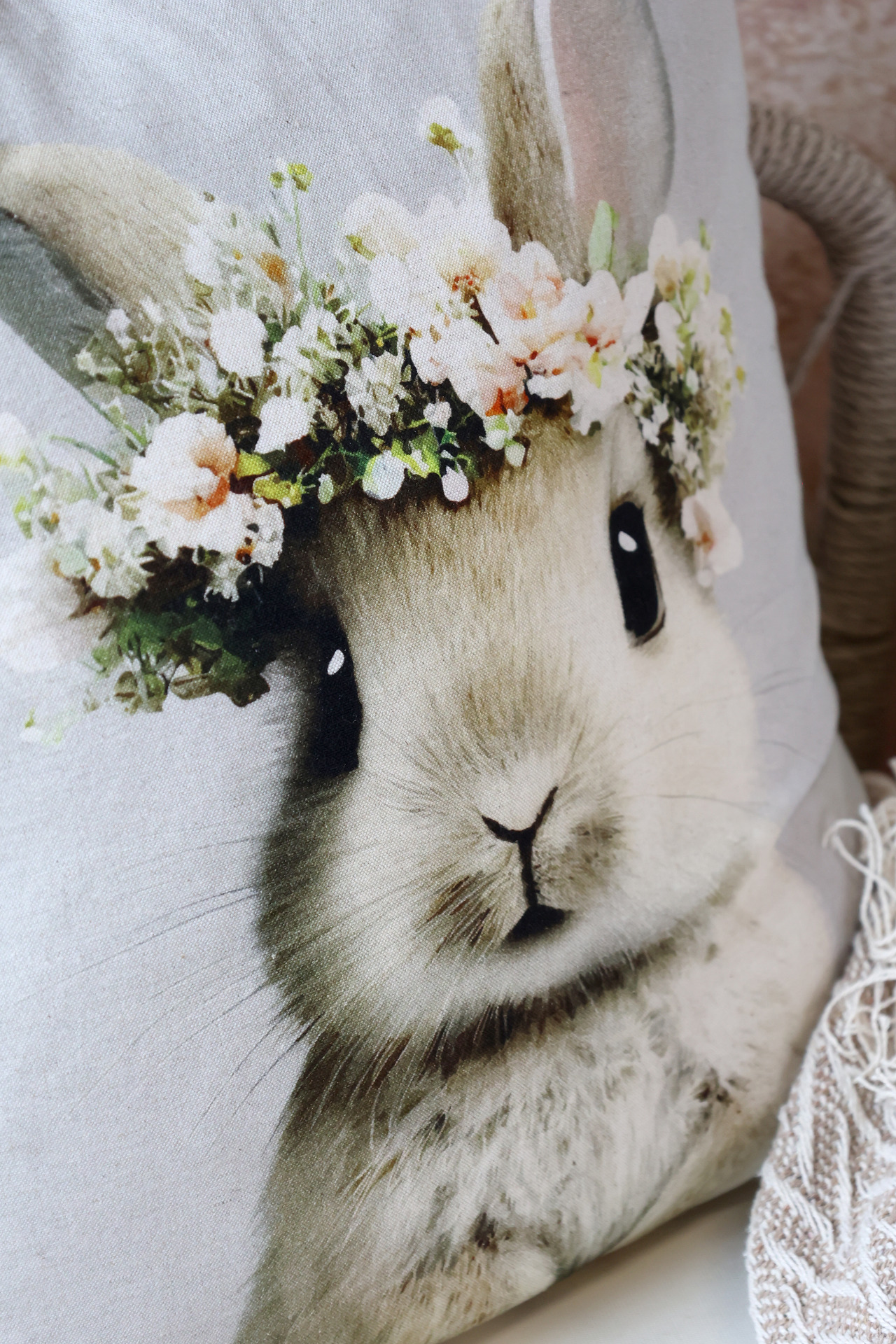 Chic Antiquekoristetyynyn päällinen jota koristaa jänis jolla on kukkaseppele päässään on ihastuttava ilon tuoja. Se sopii joka kotiin kevään ja kesän kynnyksellä mutta on myös sopivan hillitty vaikkapa lapsen/lasten tiloihin ilontuojaksi ympäri vuoden.